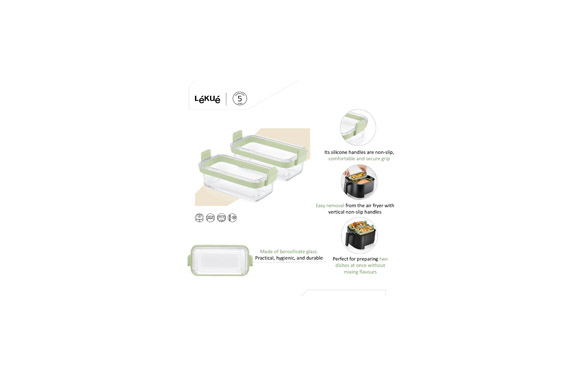 Cesta de vidrio para freidora de aire Set dos unidades, Asas de silicona plantino antideslizantes. Perfecta para freidoras de aire de 5L en adelante.Cesta fabricada en vidrio de borosilicato. Apta para freidora de aire, horno, microondas, nevera y lavavajillas. Utiliza siempre guantes protectores o manoplas para evitar completamente el riesgo de quemaduras.
